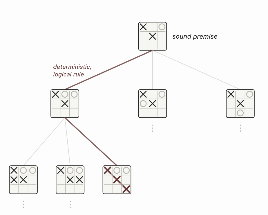 수학이나 게임처럼 “논리적으로 순수한” 영역에서는 연역 추론이 유용할 거라고 생각할 수도 있지만, 연역만으로는 확장성에 한계가 있다. 틱택토에서 최적의 수를 연역해 낼 수 있는 건 고유한 게임이 255,168개밖에 안 되기 때문이지, 체스나 바둑 같은 보드게임은 가능한 게임 수가 너무 많아 전수 탐색이 불가능하다.