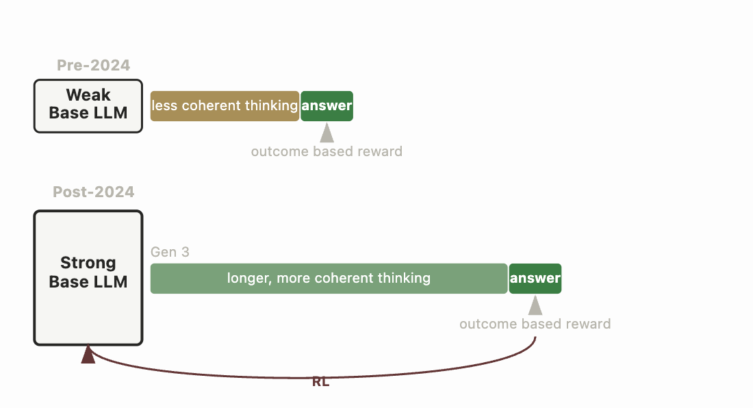 2022년, Chain-of-thought 프롬프팅, 즉 “단계별로 생각해 보자“는 기법이 등장하면서, LLM도 “중간 사고 과정”을 생성해 특정 문제 해결 과제의 성능을 끌어올릴 수 있다는 초기 신호가 나타났다. 이 발견 이후, 엔지니어들은 LLM을 더 잘 프롬프팅하는 방법을 찾으려 했다. 2023년에는 프롬프트로 LLM을 구슬리거나, 다른 LLM을 활용해 self-reflection이나 self-consistency 검증으로 생성 결과를 개선하려는 “꼼수”가 한 세대를 풍미했다. 하지만 결국 엄밀한 평가 결과, 이런 트릭들로 모델이 전반적으로 똑똑해지지는 않는다는 것이 드러났다 [1, 2, 3, 4].