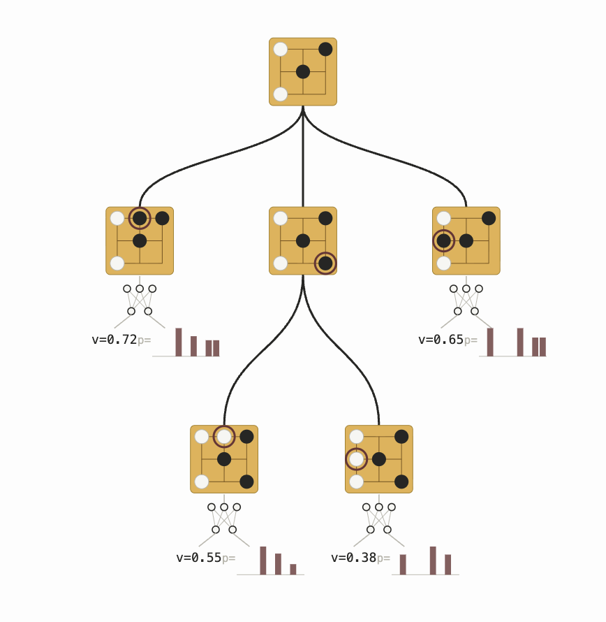 AlphaGo는 연역적 탐색과 딥러닝 기반 귀납 추론을 결합해 문제를 풀 수 있는 수준으로 만든 최초의 시스템 중 하나였다. 연역 단계는 단순하다. 둘 수 있는 수는 무엇인가? 돌을 놓으면 바둑판이 어떻게 되는가? 귀납 단계도 단순하다. 정책 네트워크로 게임 트리에서 가장 유망한 영역을 탐색하고, 가치 네트워크로 바둑판을 한눈에 “직관적으로” 보고 승률을 예측한다. 정책 네트워크는 확장 시 트리의 너비를 가지치기하고, 가치 네트워크는 트리의 깊이를 가지치기한다.